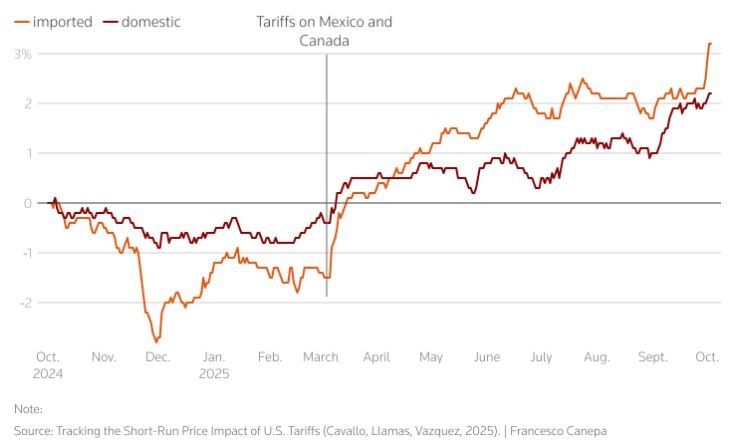 Διαπίστωσαν ότι τα εισαγόμενα προϊόντα έχουν γίνει 4% πιο ακριβά από τότε που ξεκίνησε η συζήτηση για τους δασμούς στις αρχές Μαρτίου, ενώ οι τιμές των εγχώριων προϊόντων αυξήθηκαν κατά 2%.