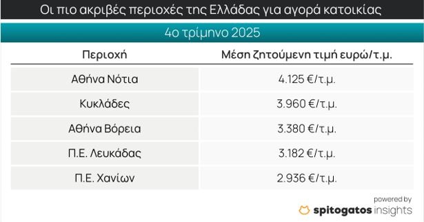 Το top 5 των πιο ακριβών σημείων της χώρας για αγορά κατοικίας συμπληρώνουν η Περιφερειακή Ενότητα (Π.Ε.) Λευκάδας και η Π.Ε. Χανίων, με ΜΖΤ στα 2.936 ευρώ/τ.μ.