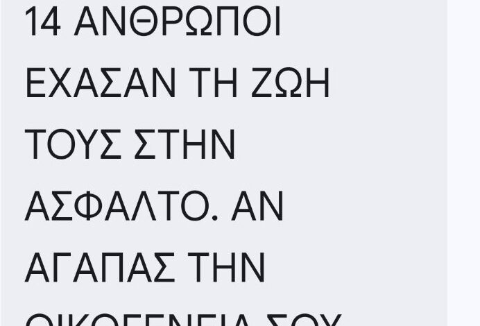 Το μήνυμα έγραφε: «Το περσινό 3ήμερο της 28ης 14 άνθρωποι έχασαν τη ζωή τους στην άσφαλτο. Αν αγαπάς την οικογένειά σου, προσοχή στο δρόμο. Υπουργείο Μεταφορών».