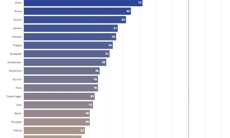 Στο 57% ενός μισθού αντιστοιχεί το μέσο ενοίκιο στην Αθήνα, σύμφωνα με τα πιο πρόσφατα στοιχεία της Κομισιόν, με την ελληνική χώρα να βρίσκεται στην έβδομη θέση της κατάταξης, πίσω από τη Μαδρίτη και τη Βαρκελώνη (74%), το Μιλάνο και τη Ρώμη (72% και 65% αντίστοιχα).