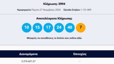 Πραγματοποιήθηκε το βράδυ της Πέμπτης (27/11) η κλήρωση 2994 του Τζόκερ που μοιράζει στην πρώτη κατηγορία πάνω από 2,2 εκατομμύριο ευρώ. Οι…