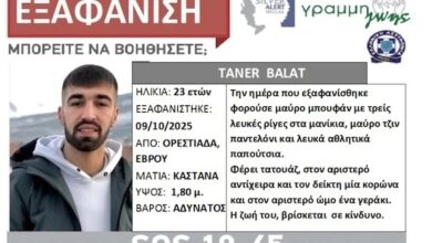 Συναγερμός έχει σημάνει στην Ορεστιάδα, για την εξαφάνιση του Taner Balat, 23 ετών, από την περιοχή του σταθμού ΚΤΕΛ στις 09/10/2025. Η…