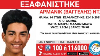 Συναγερμός έχει σημάνει για την εξαφάνιση 14χρονου από χώρο παιδικής προστασίας στον Άλιμο. Τα ίχνη του εφήβου χάθηκαν στις 22…