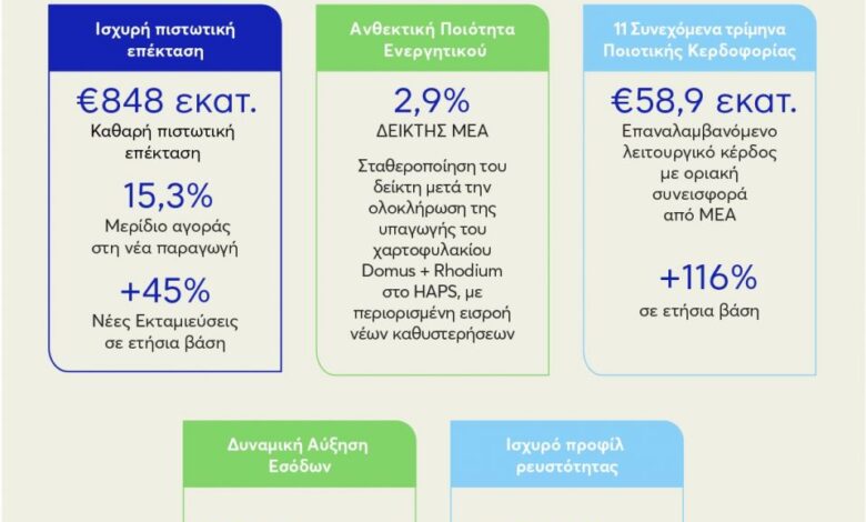 Τα επαναλαμβανόμενα κέρδη προ φόρων διαμορφώθηκαν στα €40,8 εκατ. για το εννεάμηνο 2025, έναντι μόλις €2,2 εκατ. κατά την αντίστοιχη συγκριτική περίοδο, λόγω της ισχυρής αύξησης των οργανικών εσόδων οδηγούμενα από την πιστωτική επέκταση της Τράπεζας, καθώς και των συνεργειών από τη συγχώνευση με την πρώην Παγκρήτια Τράπεζα.