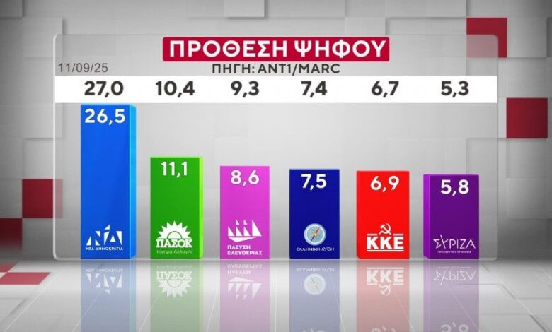 Δημοσκόπηση Marc: Σταθερά πρώτη η ΝΔ με 30,5% – Δεύτερο το ΠΑΣΟΚ, τρίτη η Πλεύση Ελευθερίας
