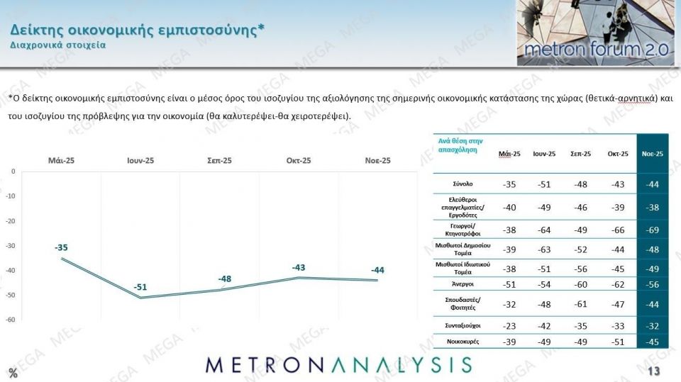 Στον δείκτη οικονομικής εμπιστοσύνης, ενδιαφέρον παρουσιάζουν τα δεδομένα για τους αγρότες και τους κτηνοτρόφους, γεγονός που αποτυπώνει το κλίμα τις περιόδου.