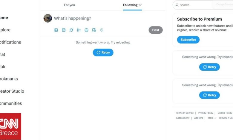 Σοβαρά προβλήματα αντιμετωπίζουν οι χρήστες της πλατφόρμας Χ (σ.σ. πρώην Twitter), καθώς δεν μπορούν να συνδεθούν ή δεν φορτώνει το περιεχόμενο της σελίδας.