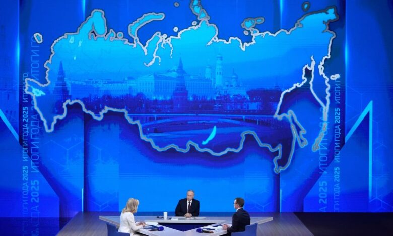 Ο Ρώσος πρόεδρος Βλαντιμίρ Πούτιν μιλάει κατά τη διάρκεια της ετήσιας συνέντευξης Τύπου και της τηλεδιάσκεψης στο Gostinny Dvor, στη Μόσχα