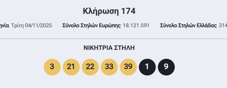 Πραγματοποιήθηκε η σημερινή (04/11) κλήρωση 174 του Eurojackpot, το οποίο μοιράζει το ποσό των 42.000.000 ευρώ.