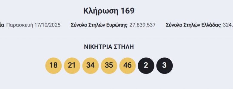Πραγματοποιήθηκε η σημερινή (17/10) κλήρωση 169 του Eurojackpot, το οποίο μοιράζει το ποσό των 68 εκατομμυρίων ευρώ και οι αριθμοί που κερδίζουν είναι οι: 18, 21, 34, 35, 46. Τζόκερ οι αριθμοί: 2 και 3.