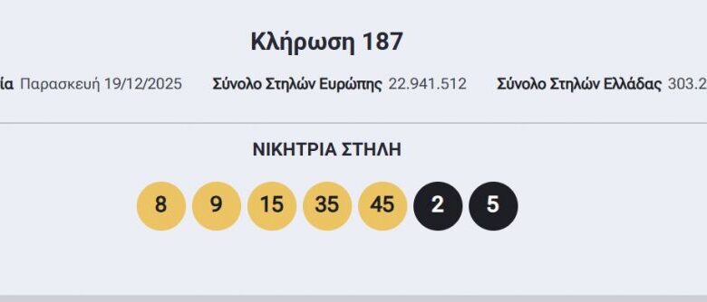 Πραγματοποιήθηκε η σημερινή (19/12) κλήρωση 187 του Eurojackpot που μοιράζει 30 εκατ. ευρώ