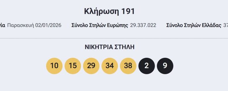 Οι τυχεροί αριθμοί, που ανέδειξε η κληρωτίδα της αποψινής κλήρωσης, είναι οι εξής: 10, 15, 29, 34, 38 και αριθμοί Eurojackpot 2 και 9.