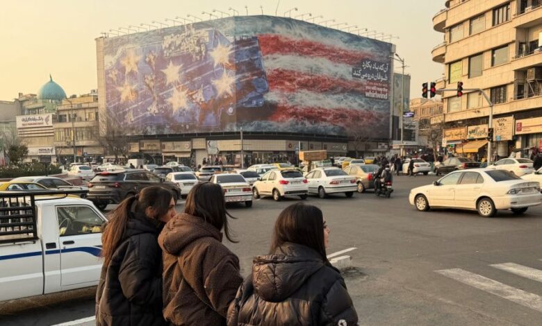 Τρία κορίτσια, που δεν φορούν μαντίλες, περνούν δίπλα από την πινακίδα που απεικονίζει ένα κατεστραμμένο αμερικανικό αεροπλανοφόρο με ακινητοποιημένα μαχητικά αεροσκάφη στο κατάστρωμά του και μια πινακίδα που γράφει στα Φαρσί και τα Αγγλικά: «Αν σπείρεις τον άνεμο, θα θερίσεις θύελλα», στην Τεχεράνη του Ιράν, την Κυριακή 25 Ιανουαρίου 2026.