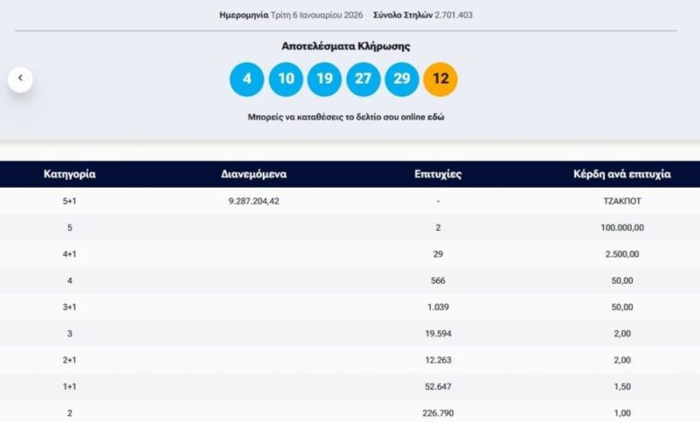 Οι τυχεροί αριθμοί της αποψινής κλήρωσης είναι οι εξής: 4, 10, 19, 27, 29 και Τζόκερ το 12.