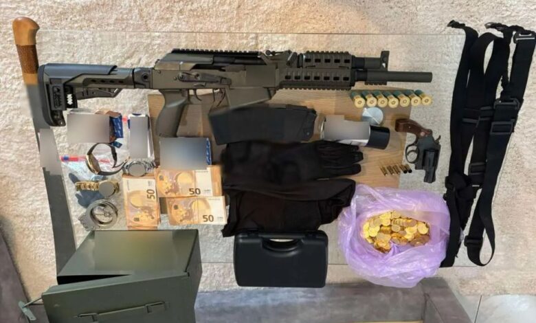Αναλυτικά, από τις έρευνες που πραγματοποιήθηκαν, βρέθηκαν και κατασχέθηκαν μεταξύ άλλων 52.930 ευρώ, 2.267 λίρες αμφιβόλου γνησιότητας, 14 πολυτελή οχήματα και ένα κλεμμένο, πέντε όπλα (περίστροφο, λυόκανο τυφέκιο, υποπολυβόλο, καραμπίνα, αεροβόλο πιστόλι), 13 αμπούλες διοξειδίου του άνθρακα, 43 ναρκωτικά και αναβολικά χάπια, ρόπαλα.