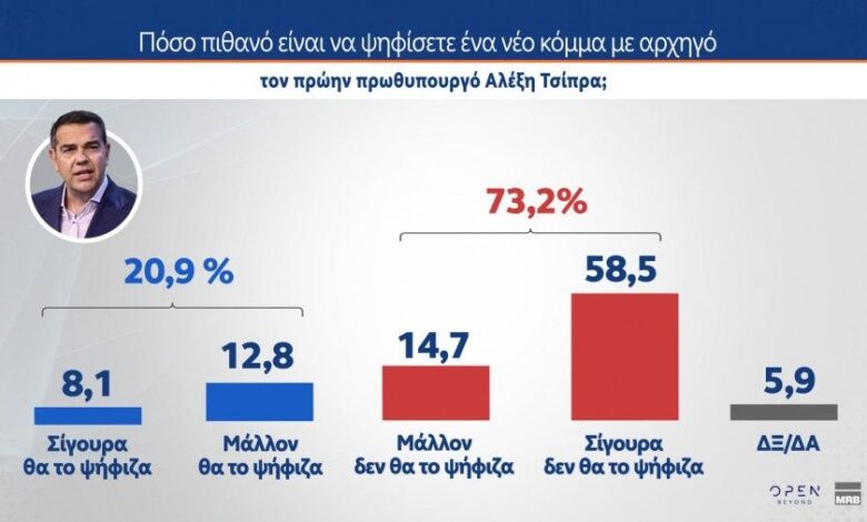 Ειδικότερα, στο δεύτερο μέρος της δημοσκόπησης που διενεργήθηκε για λογαριασμό του OPEN, το 20,9% των συμμετεχόντων δηλώνει ότι θα ψήφιζε ένα νέο κόμμα με αρχηγό τον Αλέξη Τσίπρα, ενώ το 73,2% απαντά αρνητικά.