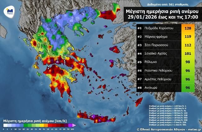 Η ισχυρότερη ριπή καταγράφηκε στην Παξιμάδα Καρύστου και ήταν ίση με 128 χλμ/ώρα ενώ ριπές άνω των 100 χλμ/ώρα καταγράφηκαν επίσης στους σταθμούς Μόρνος-φράγμα, Σέσι Παρνασσού και Σαγαίικα Αχαΐας.