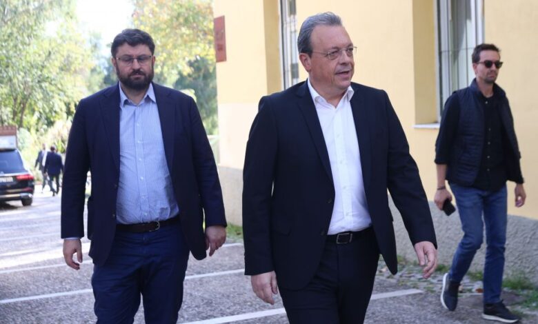 Ο πρόεδρος του ΣΥΡΙΖΑ, Σωκράτης Φάμελλος, και ο εκπρόσωπος Τύπου του κόμματος, Κώστας Ζαχαριάδης, στην πολιτική κηδεία του πρώην υπουργού και βουλευτή του ΣΥΡΙΖΑ, Αλέκου Φλαμπουράρη στο Πάρκο Ελευθερίας (χώρος πρώην ΕΑΤ-ΕΣΑ), Πέμπτη 20 Νοεμβρίου 2025.