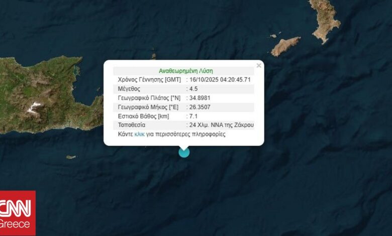 Σεισμική δόνηση μεγέθους 4,5 Ρίχτερ σημειώθηκε νωρίς το πρωί της Πέμπτης (16/10) στα ανοιχτά της Ζάκρου στην Κρήτη.