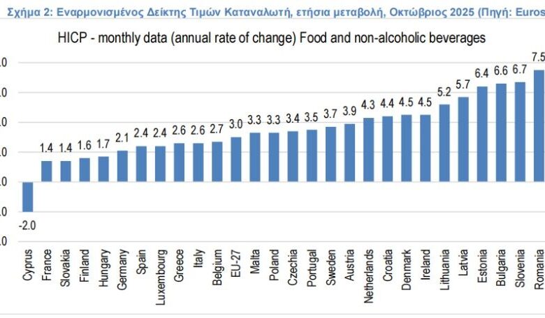 Παράλληλα, όλο το 12μηνο Νοέμβριος 2024-Οκτώβριος 2025, ο εναρμονισμένος δείκτης τροφίμων και μη αλκοολούχων ποτών παρέμεινε χαμηλότερα από τον Ευρωπαϊκό Μέσο, ενώ αρκετούς μήνες η τιμή διέφερε σχεδόν 3 ποσοστιαίες μονάδες.