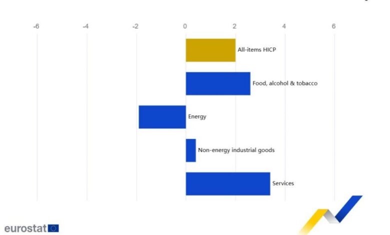 Ακολουθούν τα τρόφιμα, το αλκοόλ και τον καπνό (2,6%), τα μη ενεργειακά βιομηχανικά αγαθά (0,4%) και την ενέργεια (-1,9%).