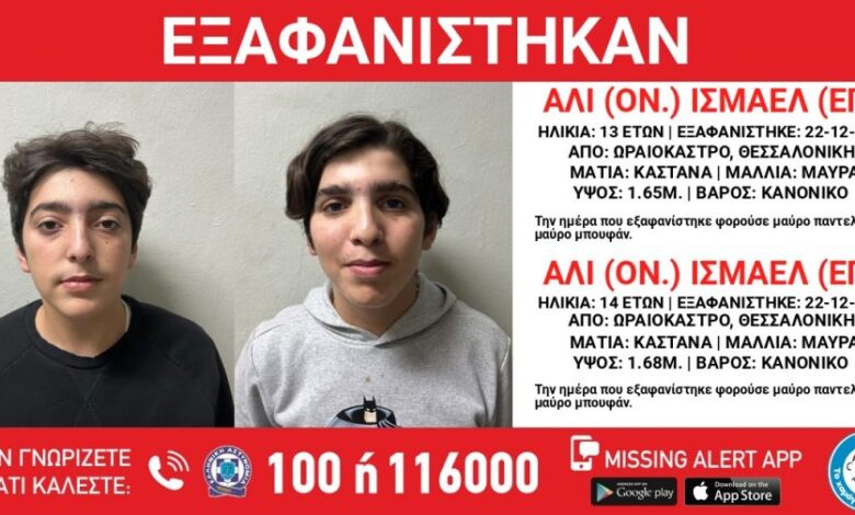 Στις 22/12/2025, πρωινές ώρες, εξαφανίστηκαν από χώρο φιλοξενίας ασυνόδευτων ανηλίκων στην περιοχή του Ωραιοκάστρου Θεσσαλονίκης, ο Ισμαέλ (επ.) Αλί (ον.), 13 ετώ και ο Ισμαέλ (επ.) Αλί (ον.),14 ετών, συριακής καταγωγής.