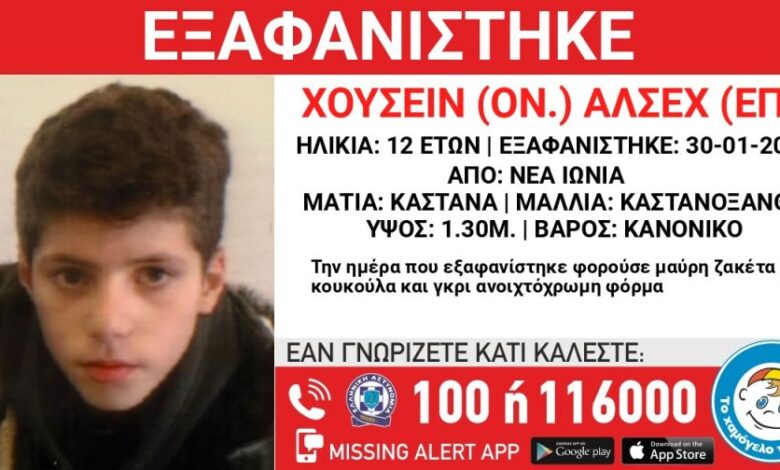 «Στις 30/01/2026 στο διάστημα από ώρα 14:50-15:07 εξαφανίστηκε από χώρο φιλοξενίας ασυνόδευτων ανηλίκων στην περιοχή της Νέας Ιωνίας, o HUSSEIN (ον.) ALSHEH (επ.), 12 ετών, συριακής καταγωγής. Το “Χαμόγελο του Παιδιού” ενημερώθηκε και προχώρησε σε δημοσιοποίηση των στοιχείων του ανήλικου, κατόπιν εισαγγελικής εντολής , καθώς ενδεχομένως να συντρέχουν λόγοι που θέτουν την ζωή του σε κίνδυνο.