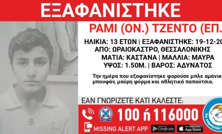 Συναγερμό σήμανε το «Χαμόγελο του Παιδιού» για την εξαφάνιση σήμερα (19/12) 13χρονου από χώρο φιλοξενίας ασυνόδευτων ανηλίκων στο Ωραιόκαστρο Θεσσαλονίκης