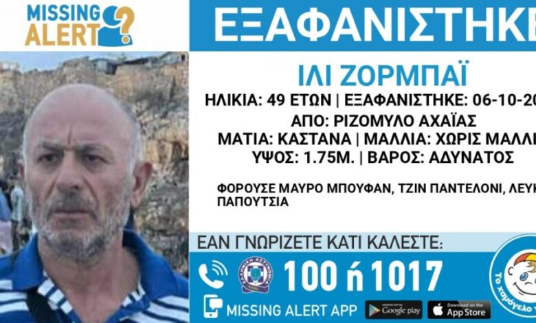 Εξαφανίστηκε 49χρονος από την περιοχή του Ριζόμυλου Αχαϊας τη Δευτέρα.