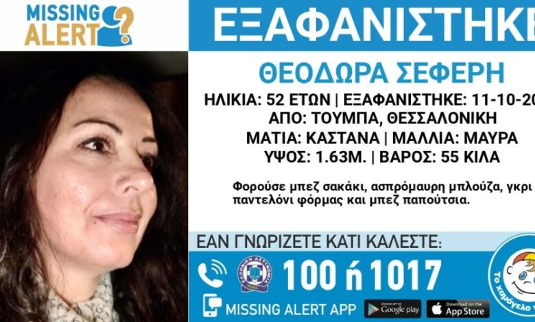 Συναγερμός έχει σημάνει στην περιοχή της Τούμπας στην Θεσσαλονίκη για την εξαφάνιση 52χρονης, η ζωή της οποίας βρίσκεται σε κίνδυνο.