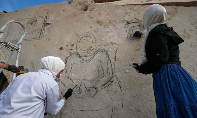 Καλλιτέχνιδες από τη Συρία σκιαγραφούν μια τοιχογραφία στην κατεστραμμένη οροφή ενός σπιτιού που είχε υποστεί ζημιές από τον πόλεμο στη Νταράγια, στα περίχωρα της Δαμασκού.