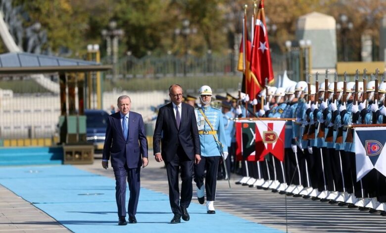 Ο Τούρκος πρόεδρος Ρετζέπ Ταγίπ Ερντογάν με τον Γερμανό Καγκελάριο Φρίντριχ Μερτς στην Άγκυρα στις 30 Οκτωβρίου, 2025