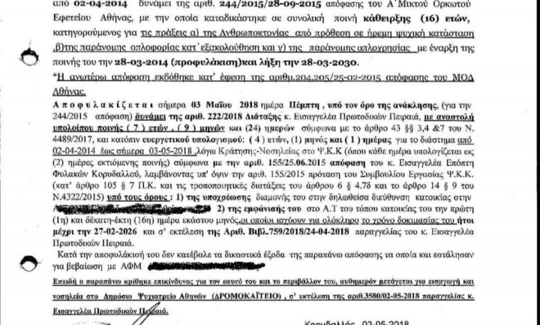 Συγκεκριμένα, στο αποφυλακιστήριο που παρουσιάζει το CNN Greece, o δράστης του φονικού στη Γλυφάδα είχε εξέλθει τέσσερα χρόνια αφού σκότωσε την μητέρα του και αφού είχε καταδικαστεί σε δεκαέξι χρόνια κάθειρξης για ανθρωποκτονία από πρόθεση σε ήρεμη ψυχική κατάσταση, καθώς και για παράνομη οπλοφορία κατ’ εξακολούθηση και παράνομη οπλοχρησία.