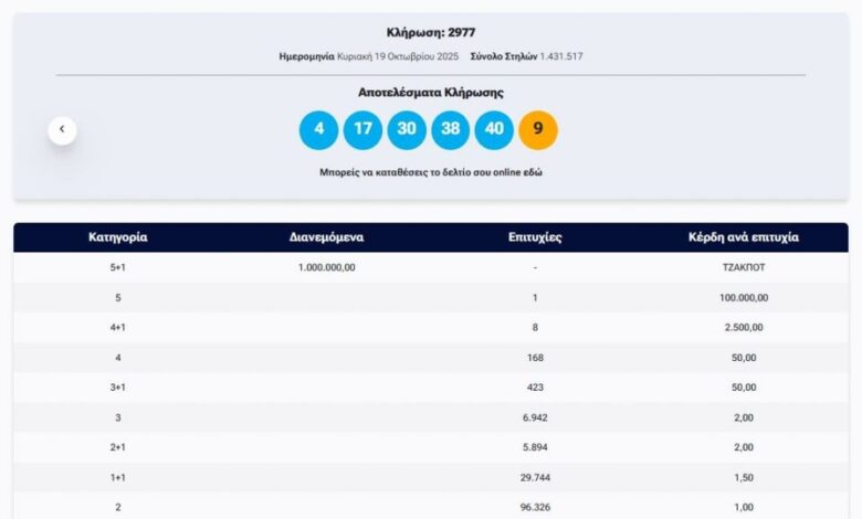 Πραγματοποιήθηκε το βράδυ της Κυριακής 19 Οκτωβρίου η υπ’ αριθμόν 2977 κλήρωση Τζόκερ του ΟΠΑΠ, που μοιράζει στους τυχερούς της πρώτης κατηγορίας πάνω από 1.000.000 ευρώ.