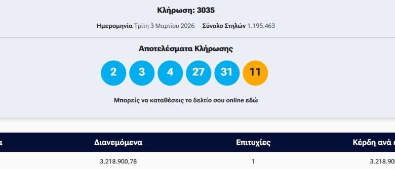Πραγματοποιήθηκε το βράδυ της Τρίτης (03/03) η κλήρωση 3035 του Τζόκερ που μοιράζει στην πρώτη κατηγορία τουλάχιστον 3.200.000 ευρώ.