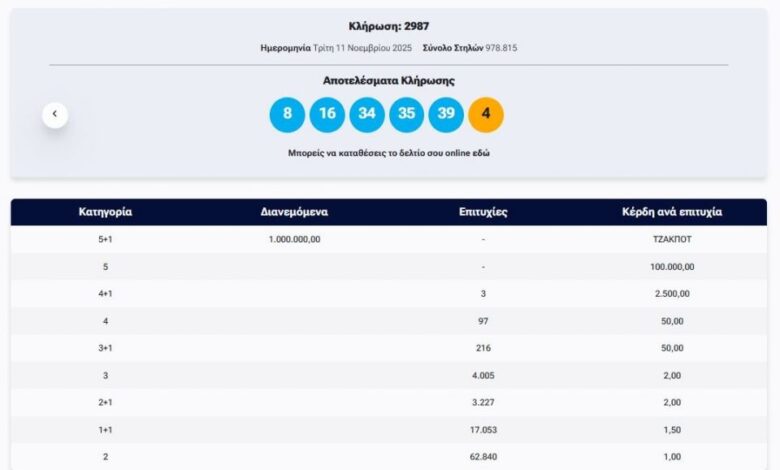 Πραγματοποιήθηκε το βράδυ της Τρίτης (11/11) η κλήρωση 2987 του Τζόκερ που μοιράζει στην πρώτη κατηγορία πάνω από 1 εκατ. ευρώ.