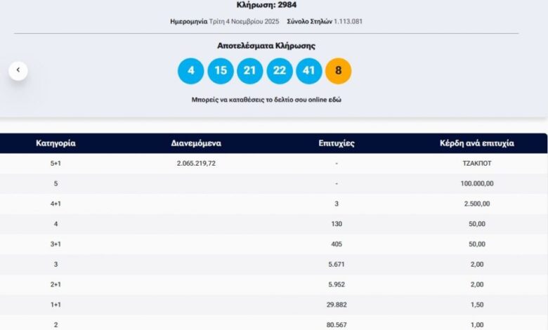 Οι τυχεροί αριθμοί της κλήρωσης είναι οι εξής: 4, 15, 21, 22, 41 και Τζόκερ ο αριθμός 8.