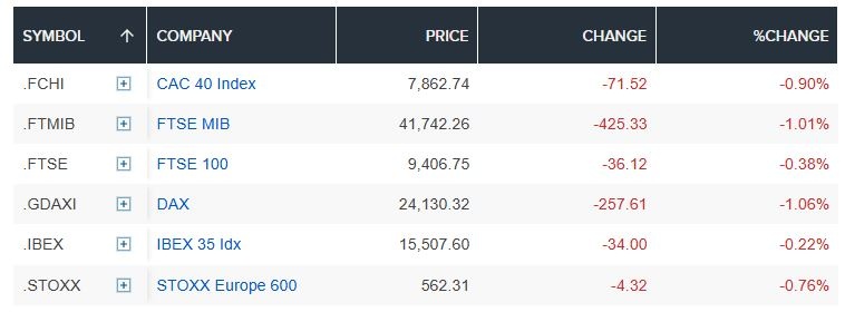 Την ίδια ώρα και οι ευρωπαϊκές μετοχές βρίσκονται στο «κόκκινο» αντιστρέφοντας το σε μεγάλο βαθμό θετικό κλίμα που επικρατούσε στην αρχή της εβδομάδας, παρά την απειλή νέας εμπορικής διαμάχης μεταξύ των ΗΠΑ και της Κίνας.