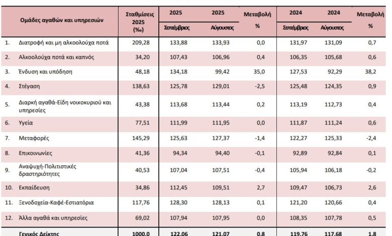 Συγκεκριμένα, από τη σύγκριση του Γενικού ΔΤΚ του μηνός Σεπτεμβρίου 2025 με τον αντίστοιχο Δείκτη του Σεπτεμβρίου 2024 προέκυψε αύξηση 1,9% έναντι αύξησης 2,9% που σημειώθηκε κατά την αντίστοιχη σύγκριση του έτους 2024 με το 2023.